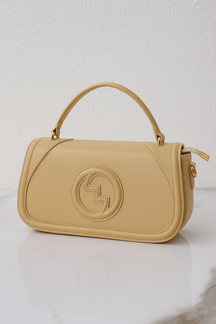 Textured Top-Handle Shoulder Bag – A chic and structured handbag with a two-tone finish and embossed circular logo for a refined, modern look.